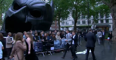 | Fãs aguardam os astros ao lado de máscara gigante do Batman na pré-estreia europeia de "Batman: O Cavaleiro das Trevas Ressurge" em Londres |
